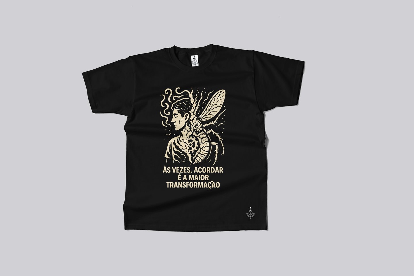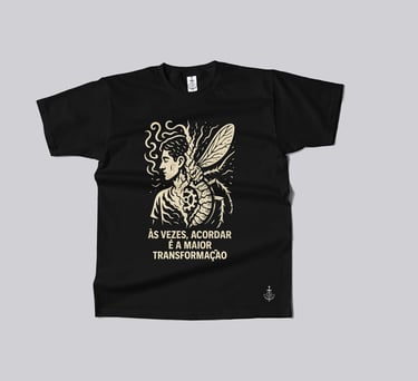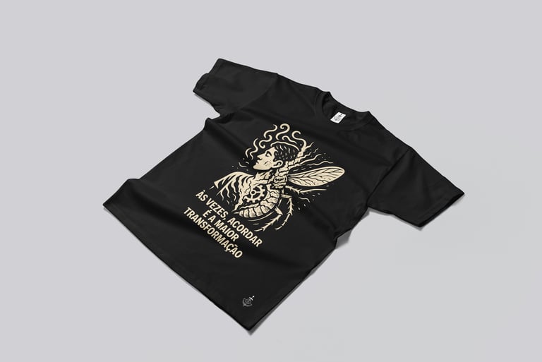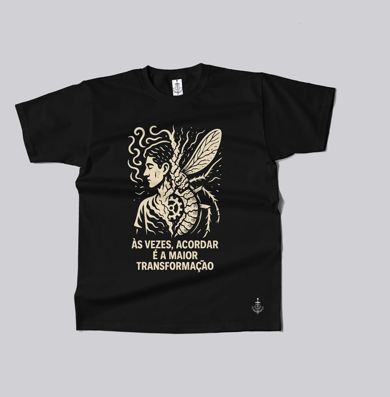 Essa camiseta é uma ode à “Metamorfose” que todos vivemos diariamente — não apenas a de Gregor Samsa, mas a nossa própria: a transformação silenciosa que acontece cada vez que despertamos e vestimos a máscara da produtividade, das obrigações e do “bom dia” automático.