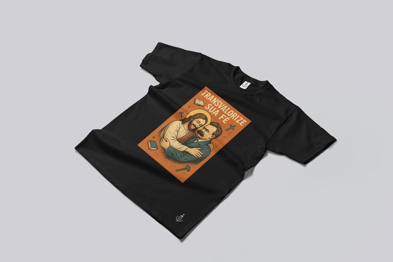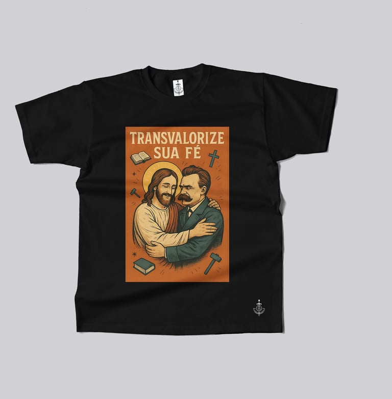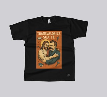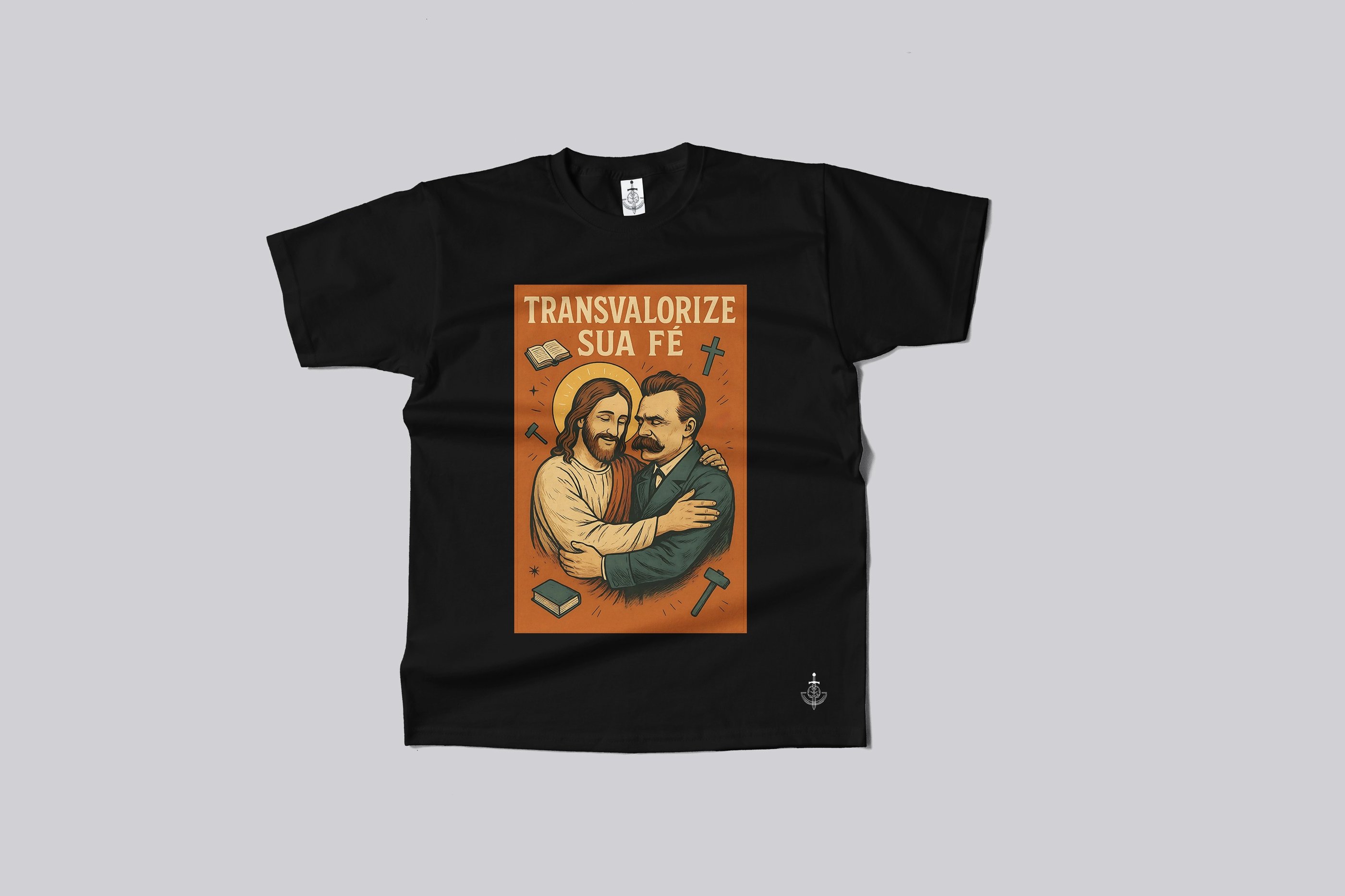 Imagine entrar num café e ver Nietzsche e Jesus trocando ideias sobre o sentido da vida, com um capuccino na mão e uma Bíblia aberta em cima de um livro de filosofia. Não, você não bateu a cabeça: você só viu essa camiseta. “Transvalorize sua fé” não é só uma frase, é uma provocação gentil — daquelas que cutucam o espírito sem arrancar os olhos.