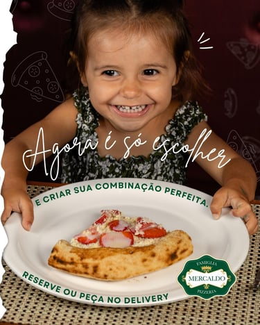 Criação de conteúdos para a Mercaldo Pizzeria, unindo carrosséis, vídeos, stories e reels com estratégia e consistência visual no digital.